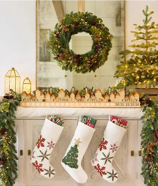 Greet your guests with a nostalgic sight with stockings hung from a console or sideboard and styled with an array of spectacular accents.